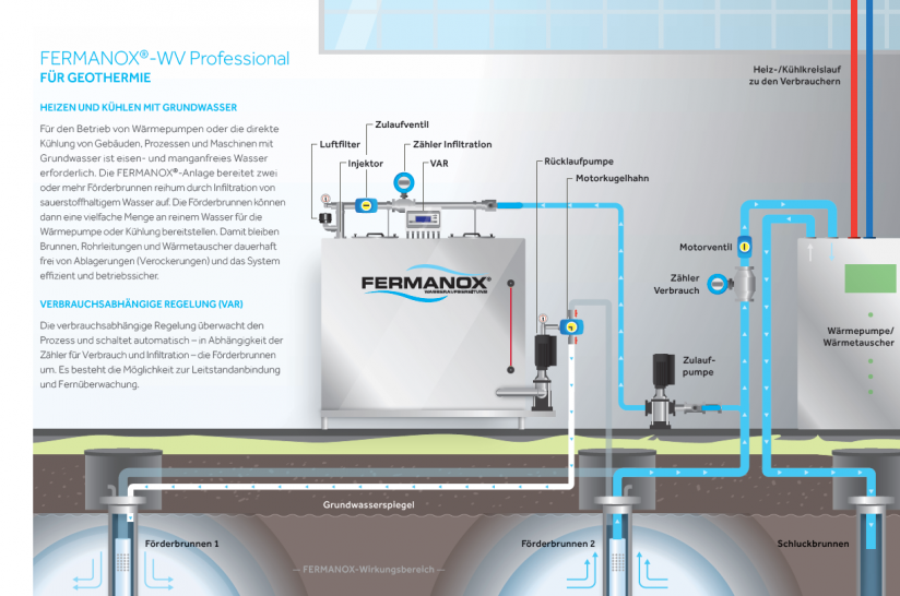 Eine Schlüsselrolle spielt hierbei die FERMANOX®-Technologie. Sie ermöglicht die unterirdische Oxidation von Metallionen im Grundwasser und gewährleistet so durch die Vermeidung von Ablagerungen (Verockerungen) den langfristig störungsfreien Betrieb von thermischen Brunnenanlagen. Damit wird die Geothermie noch zuverlässiger und langfristig wirtschaftlicher.